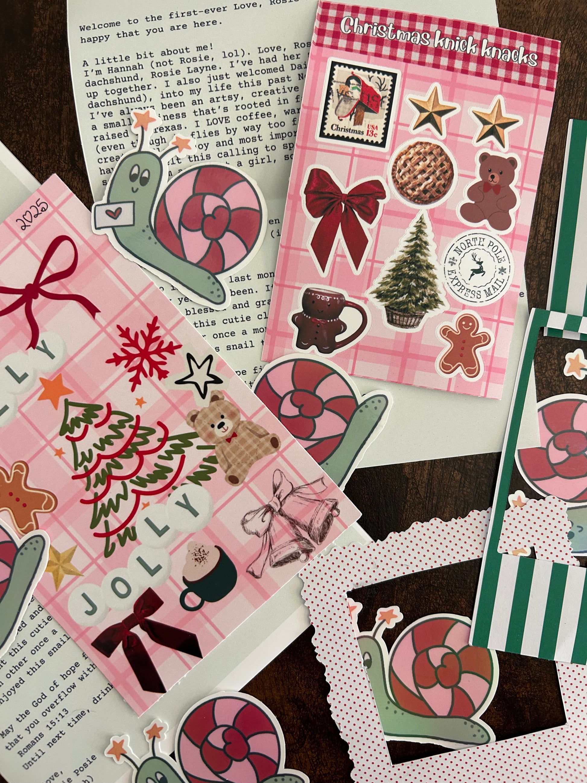 letter, postcard print, sticker sheet, new months snail sticker, & extra mystery goodies (extra goodies could be bookmarks, extra stickers, cutie scrap papers, literally anything)